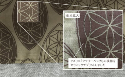 ブラックアイガイアスセラミックをクスリエ・フラワーベシカ柄で3重ガーゼ生地にプリント。