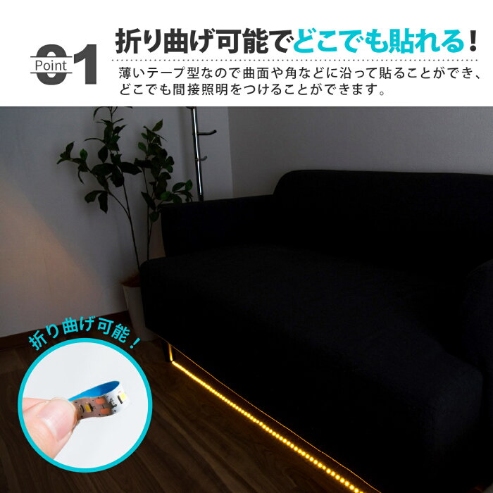 【SS期間 店内全品P10倍◎更にお得なクーポンあり】LEDテープライト 2m 間接照明 テープライト USB接続 両面テープ シール 昼光色 電球色 イルミネーション ライト インテリア ディスプレイ 120灯 曲がる カット可能 おしゃれ お洒落 工作 DIY 照明 貼るだけ 配線不要 貼るだけ・配線不要でお好きな長さにカットできるUSB接続のテープ型ライトです。