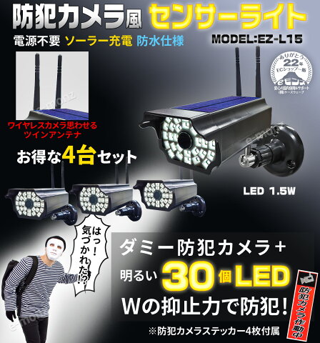 防犯用 ダミーカメラ LEDライト ソーラーパネル 人感センサー 自動点灯 防水IP54 【 防犯カメラ風ソーラー充電センサーライト EZ-L15 4台セット 】 防犯カメラ 監視カメラ フェイクカメラ セキュリティカメラ ガーデンライト 街灯 防犯対策明るいセンサーライト + ダミーカメラでWの抑止力! 防犯カメラ風 ソーラーセンサーライト MODEL: EZ-L15 お得な×4台セット 電源不要・ソーラー充電式 防犯カメラ風センサーライト機能 ■ 便利なセンサーライト + ダミーカメラで一石二鳥 防犯カメラにそっくりなLEDセンサーライト。